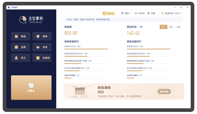 “多宝掌柜”是面向小微型零售企业提供数字化收银系统及智能店铺解决方案的智慧平台。 致力于为零售商提供收银机、收银软件和会员管理系统。真正做到“我的生意随我意!”。